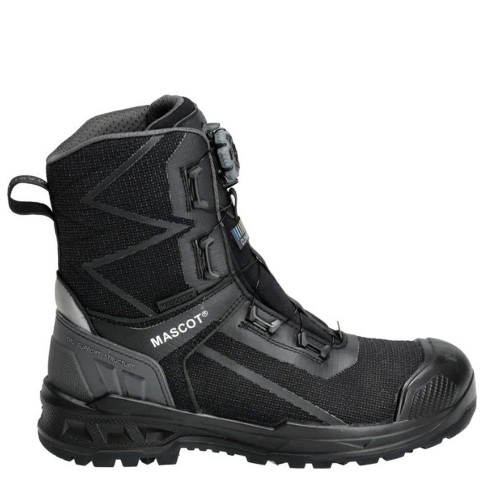 Opens and fastens with BOA® Fit System, which consists of a rotational dial, lace and guides. Ergonomically formed aluminium toe cap. Midsole of PU. Rubber outsole with rubber friction inserts. Removable insoles, anti-static and durable. Absorbs and removes moisture. Moulded TPU scuff cap. The sole is oil and petrol resistant. Heat resistant sole up to 300°C contact heat. Ladder grip. Shock absorbing insole. Thinsulate™ insulation. Waterproof membrane of MASCOTEX®. Water-repellent and breathable outer fabric. Suitable for working on the knees. Heel cap. ESD approved to EN IEC 61340-4-3: 2018, EN 61340-5-1: 2016. S7S FO SR HRO HI CI SC LG ESD EN ISO 20345:2022