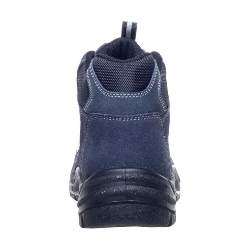 Grey suede sports safety boot. Steel toe cap and steel midsole protection. Padded collar and tongue for added comfort. Dual density polyurethane outsole. Anti-static. Anti-scuff toe guard. Ideal for light type industry use.